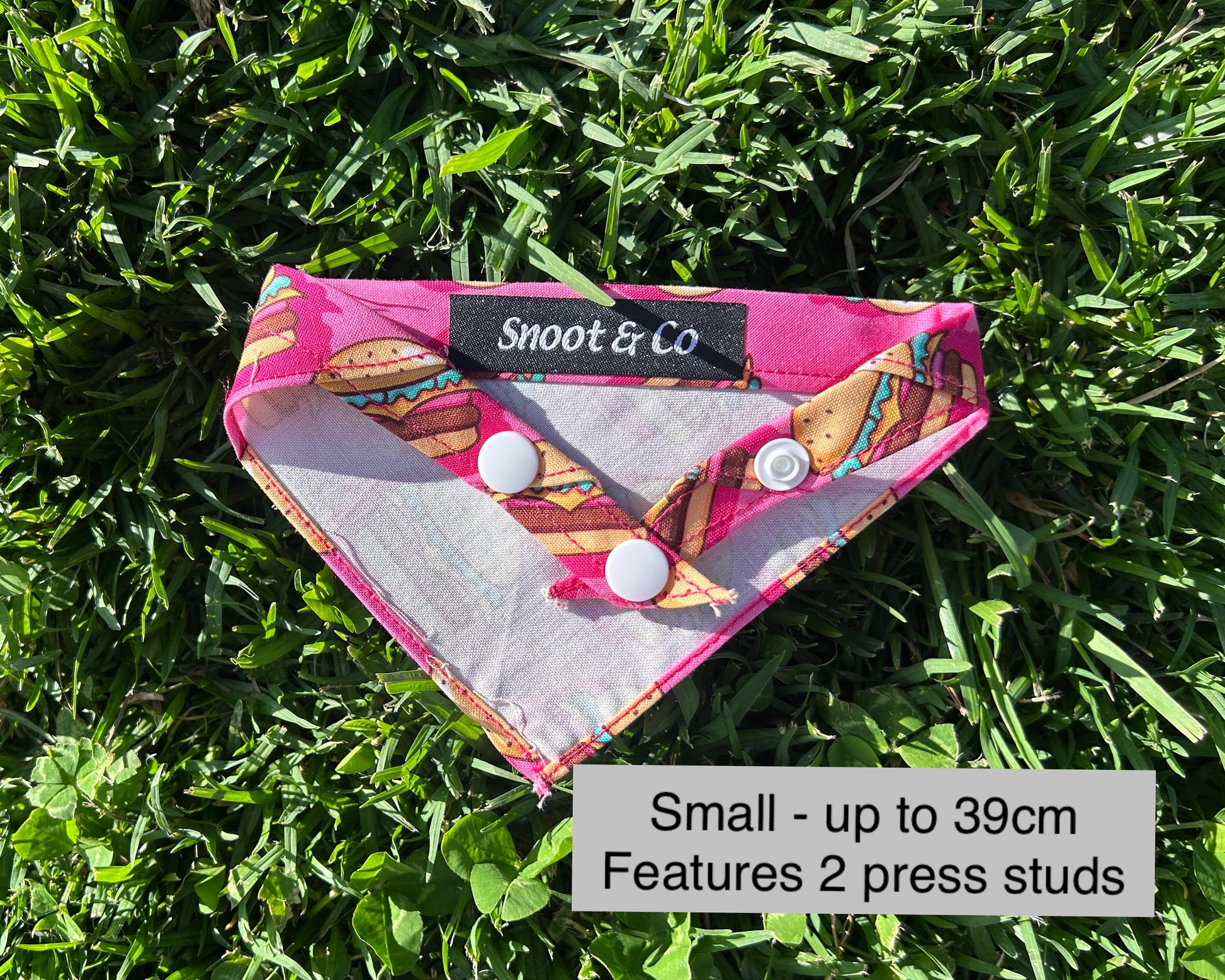 Serve up some style with our Burgers Dog Bandana, a fun addition to our playful Food Collection! Featuring a mouth-watering pattern of colourful burgers, this design is perfect for pups with big personalities and an appetite for attention.