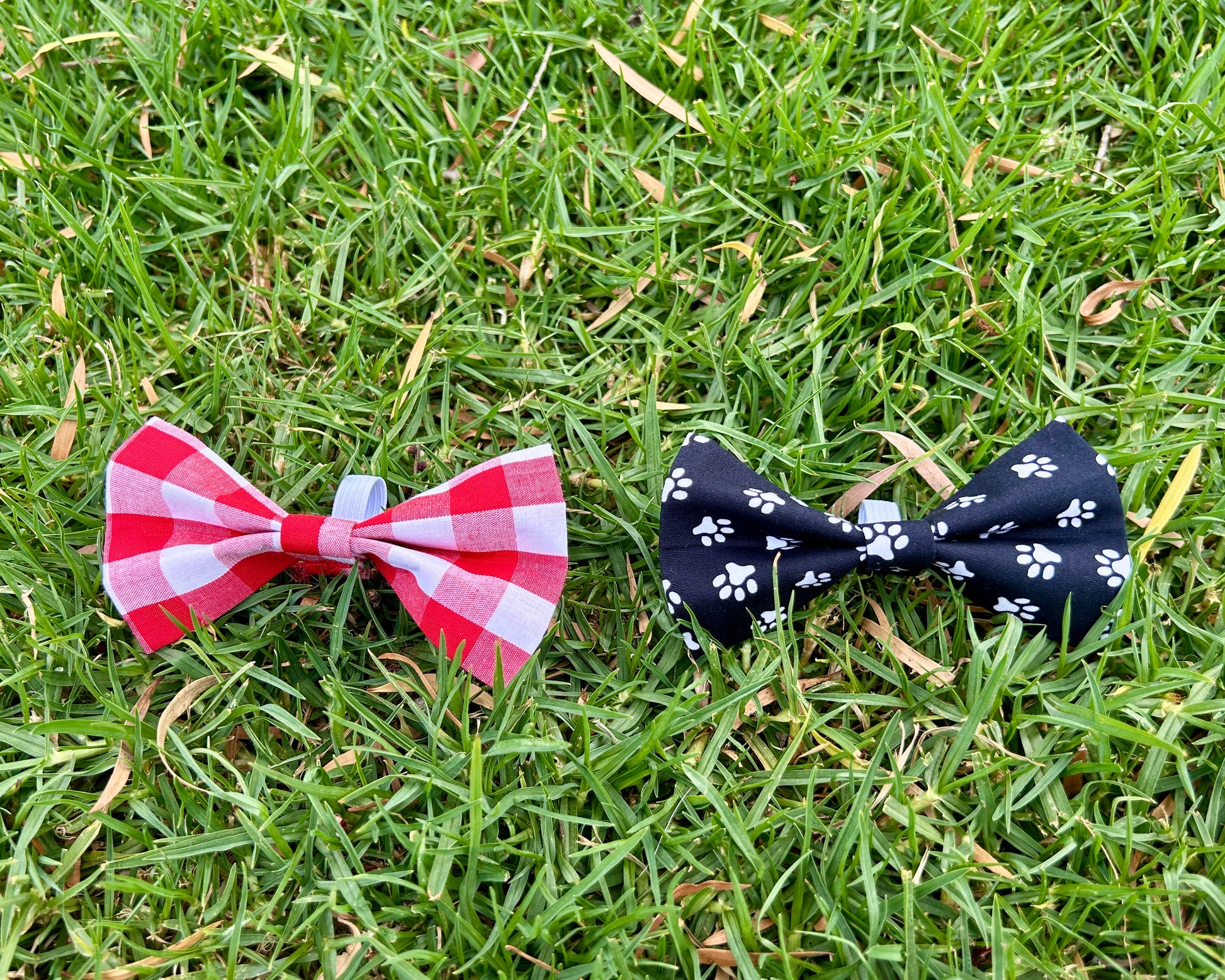 - Black Pawprint: A playful and stylish bow tie featuring black pawprints on a crisp white background, ideal for any pup who loves to show their love for paws!