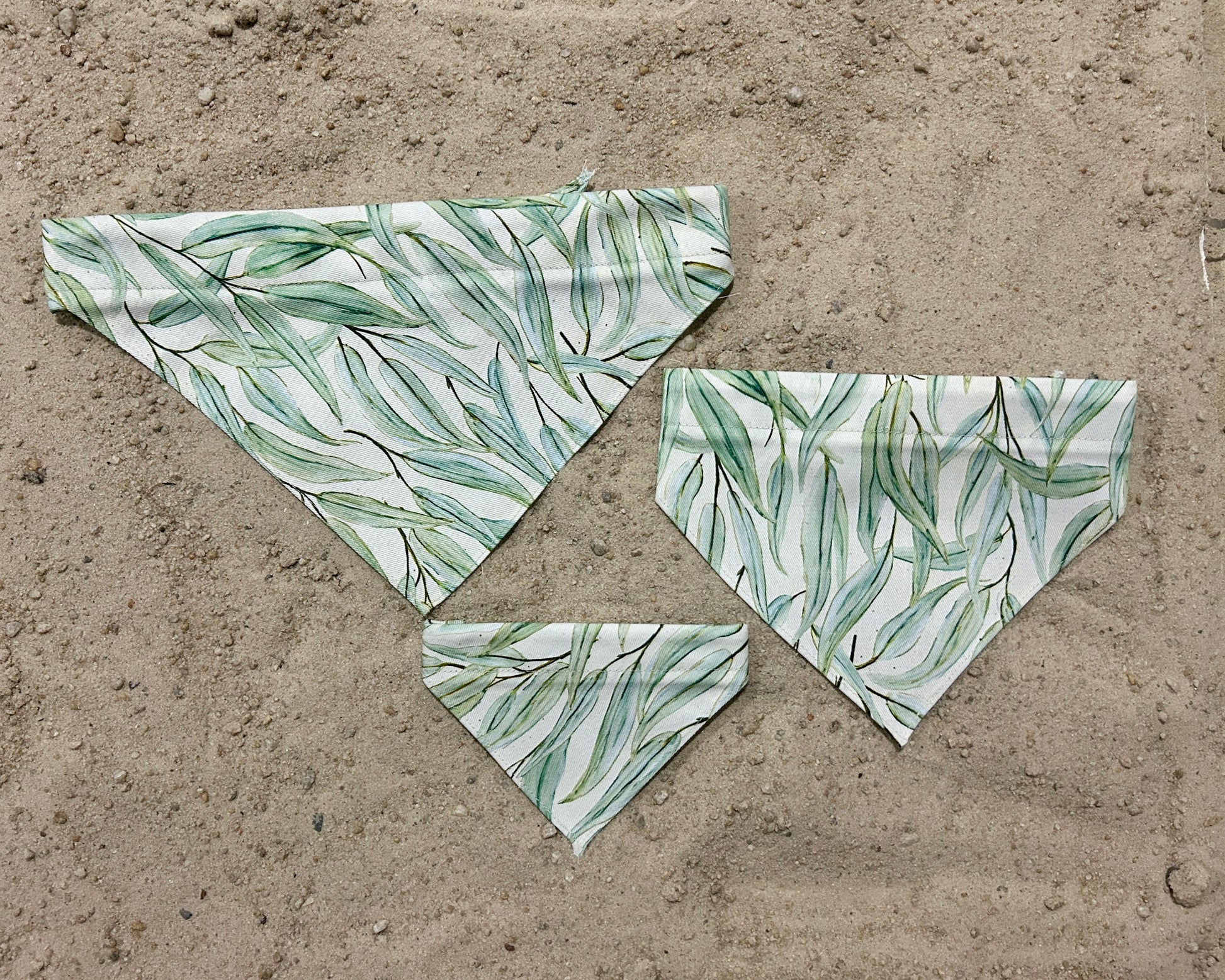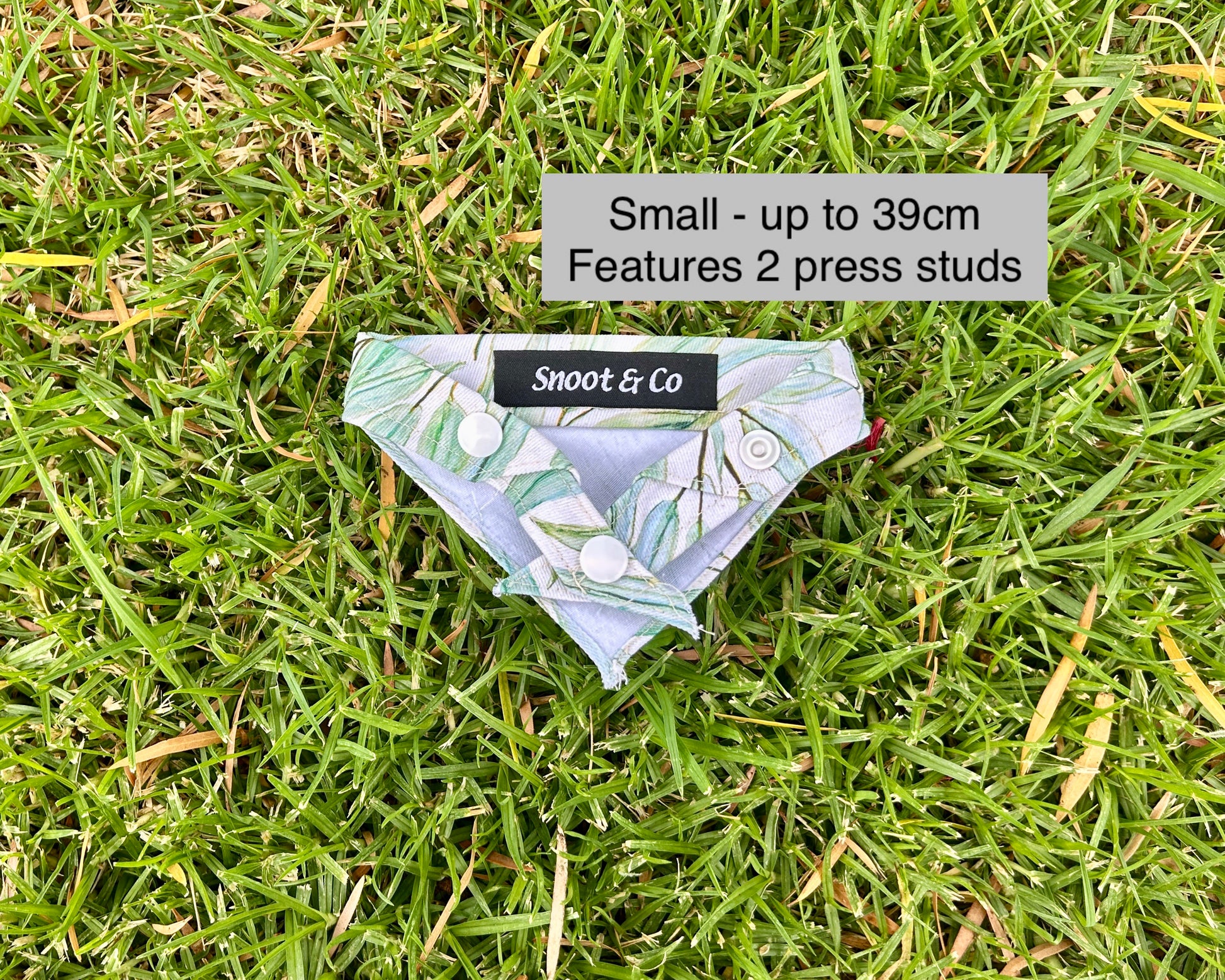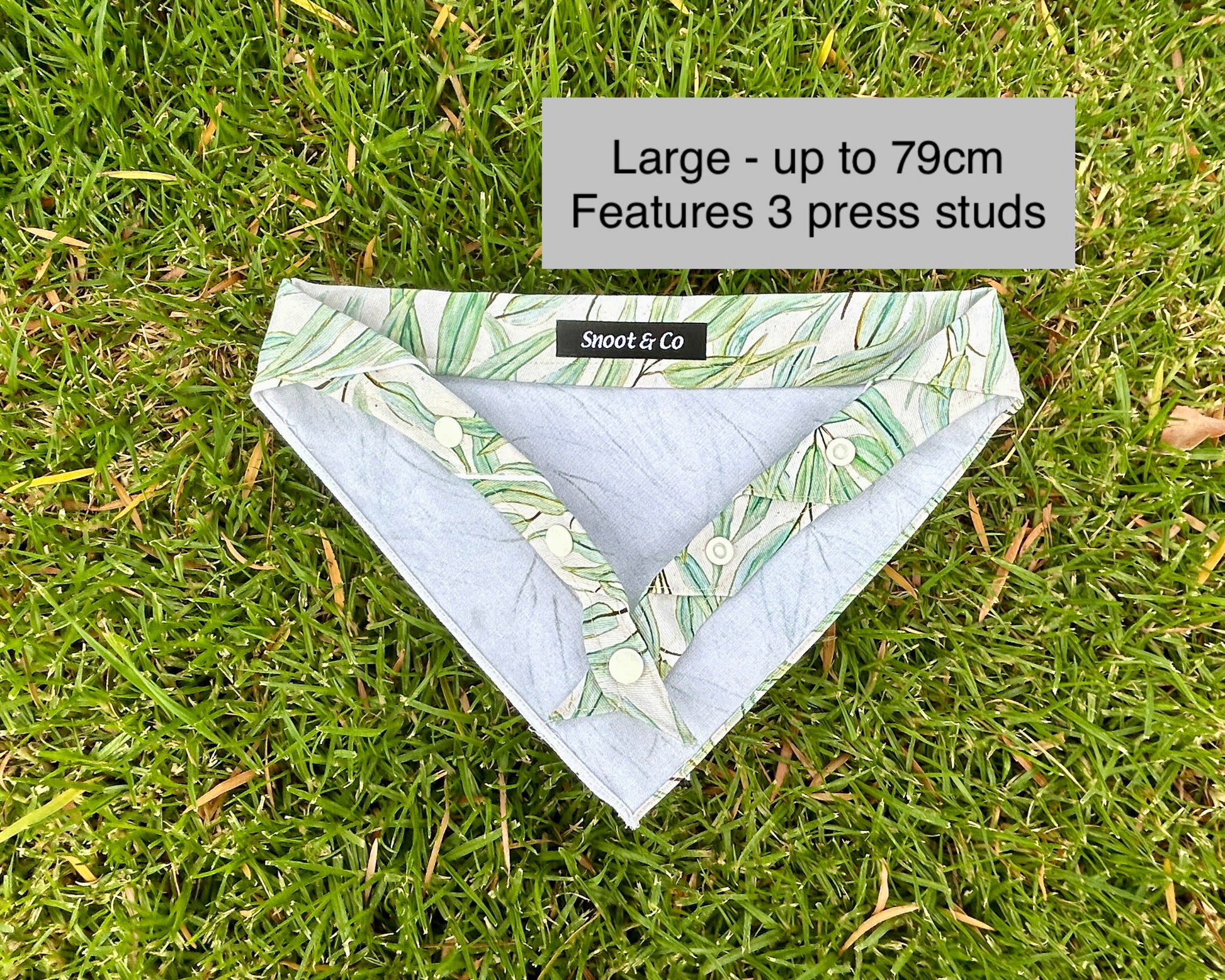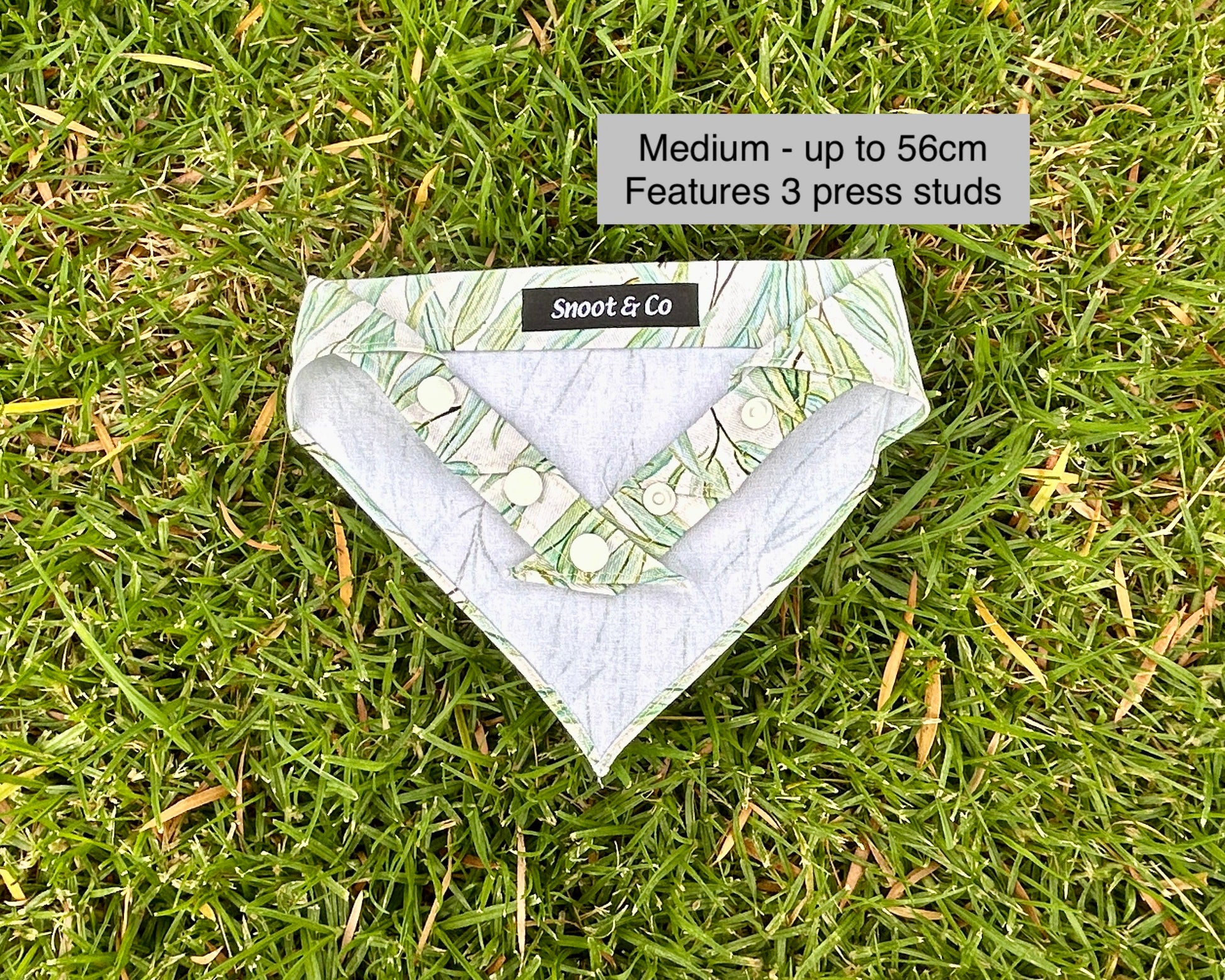 Embrace the beauty of nature with our Eucalyptus Dog Bandana! Featuring a delicate eucalyptus print, this bandana is perfect for adding a fresh, earthy touch to your pup’s wardrobe. With both a snap closure and tie option, it’s adjustable for a comfortable fit on dogs of all sizes. It’s ideal for summer outings, bushwalks, or simply showing off your dog’s style. Handcrafted with care, this bandana is a timeless accessory inspired by the Australian outdoors.