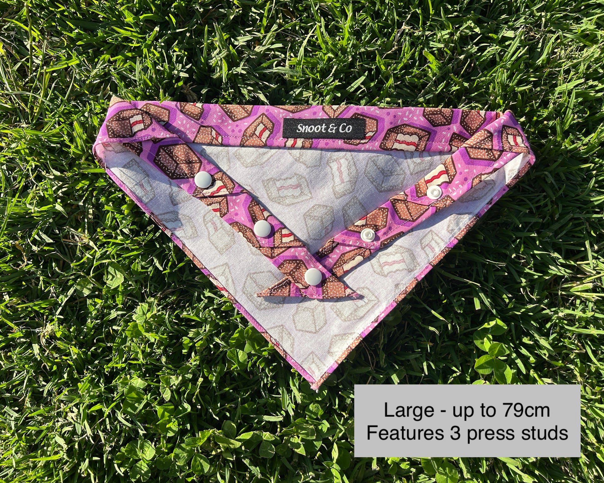 Celebrate an Aussie favourite with our Lamingtons Dog Bandana, part of our deliciously fun Food Collection! Featuring a playful pattern of chocolate-dusted, coconut-covered lamingtons, this bandana is perfect for pups who love to show off a little personality (and Aussie pride).