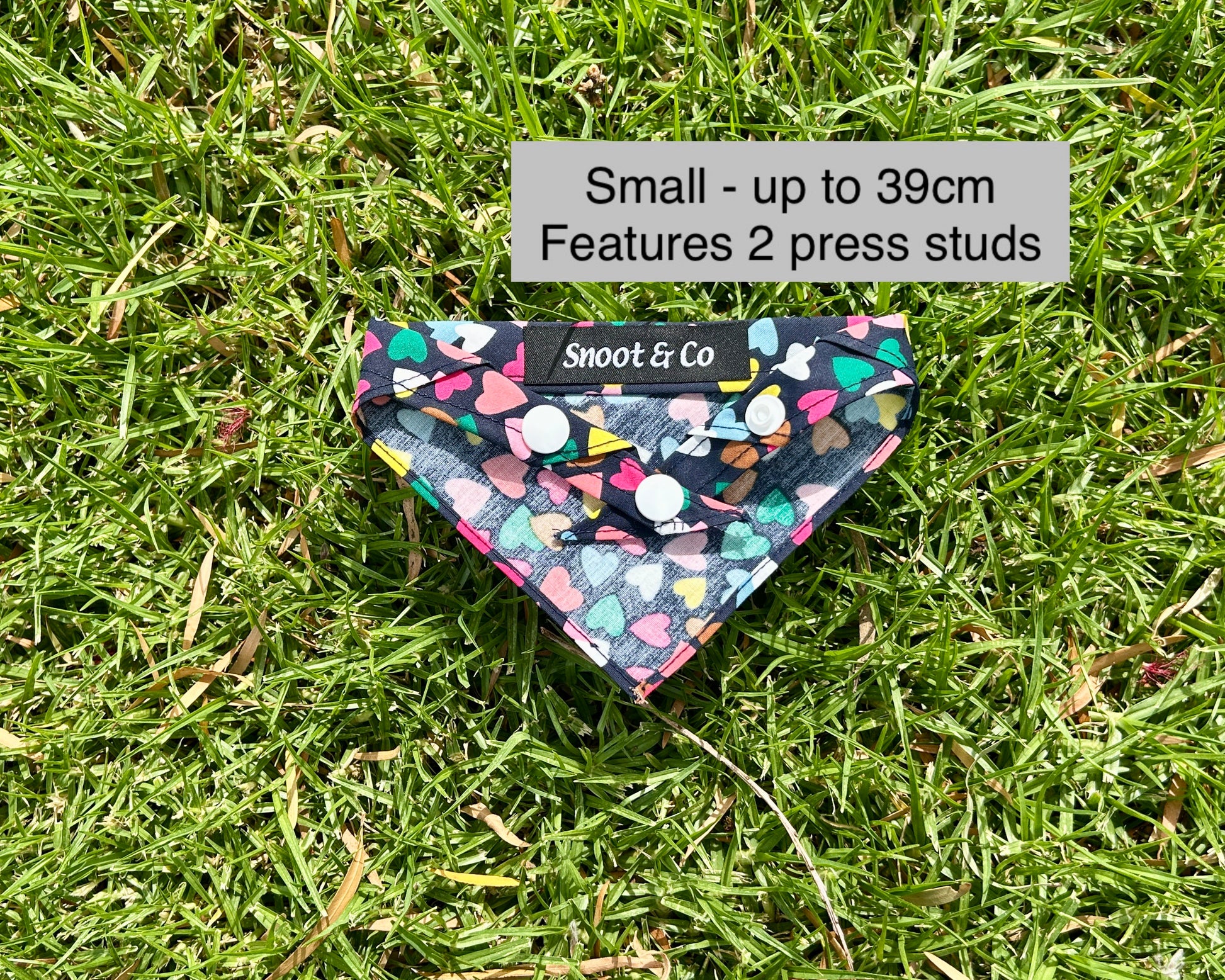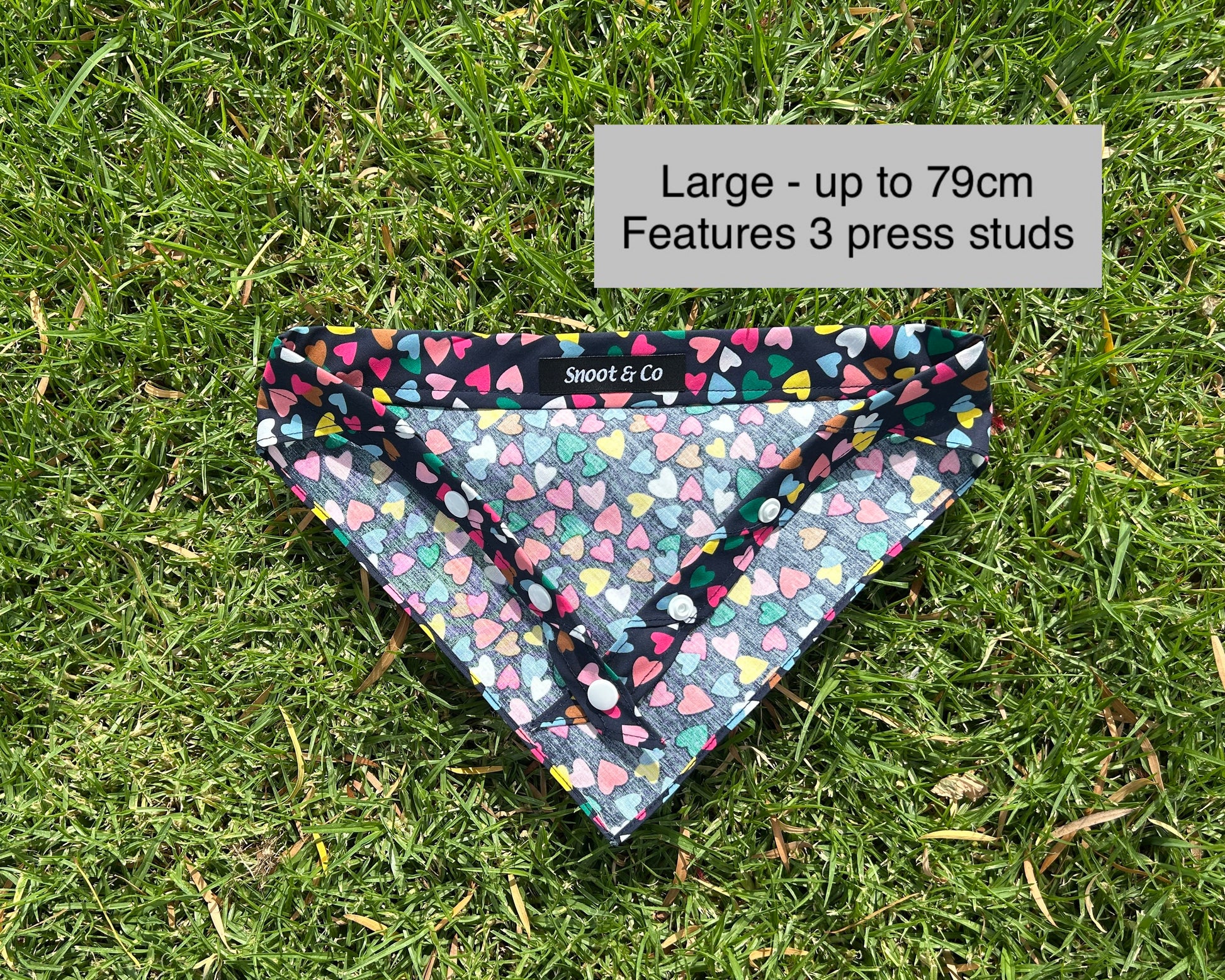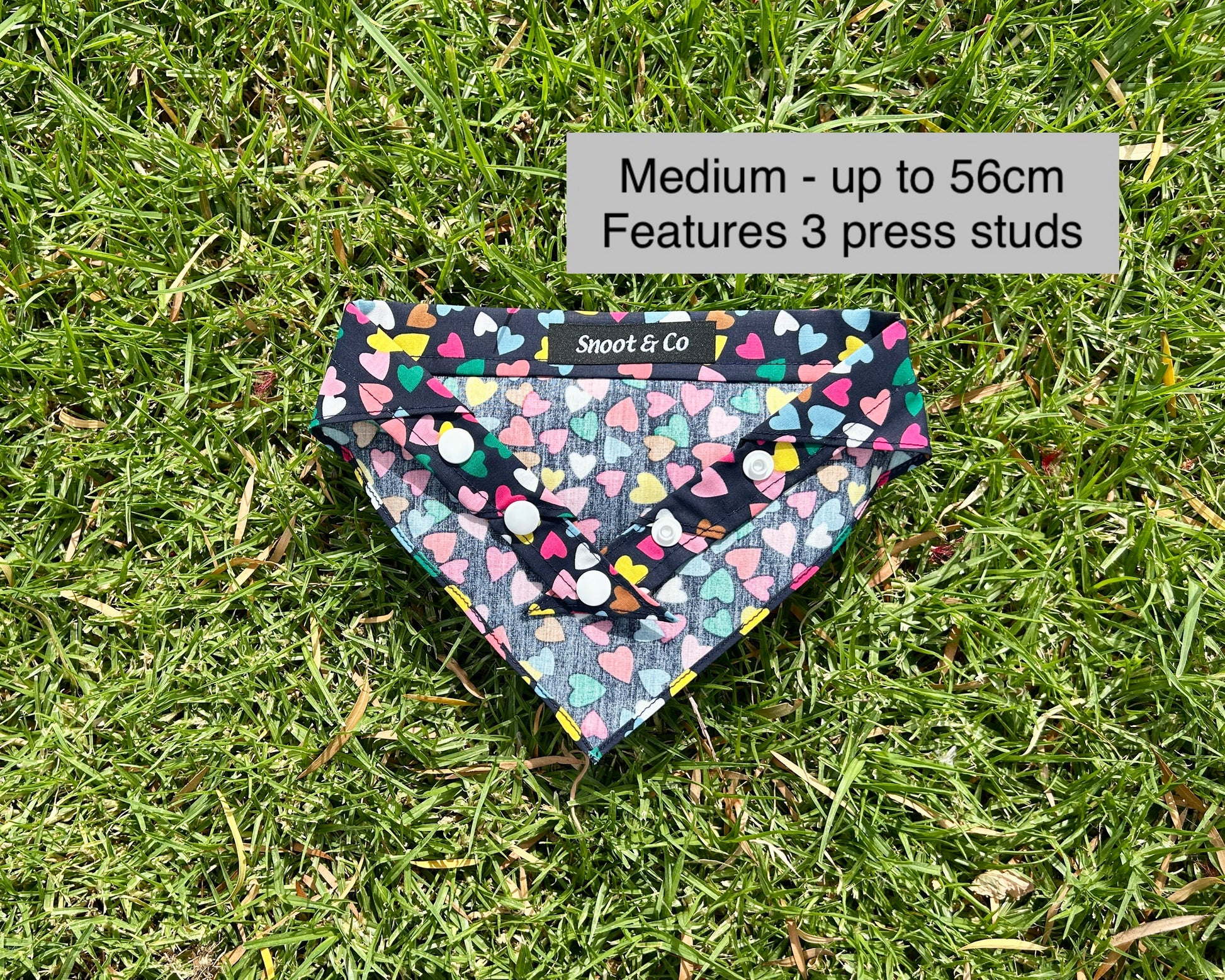Brighten up your pup’s look with our Multi-Coloured Hearts Dog Bandana, part of our Valentine’s Day Collection! Featuring a delightful pattern of vibrant hearts on a deep navy background, this bandana adds a fun and charming touch to your furry friend’s style. Designed with both a snap closure and tie option, it provides a secure, adjustable fit for dogs of all sizes. Perfect for Valentine’s Day celebrations or spreading love year-round, this bandana is a playful, heart-filled accessory your pup will adore!