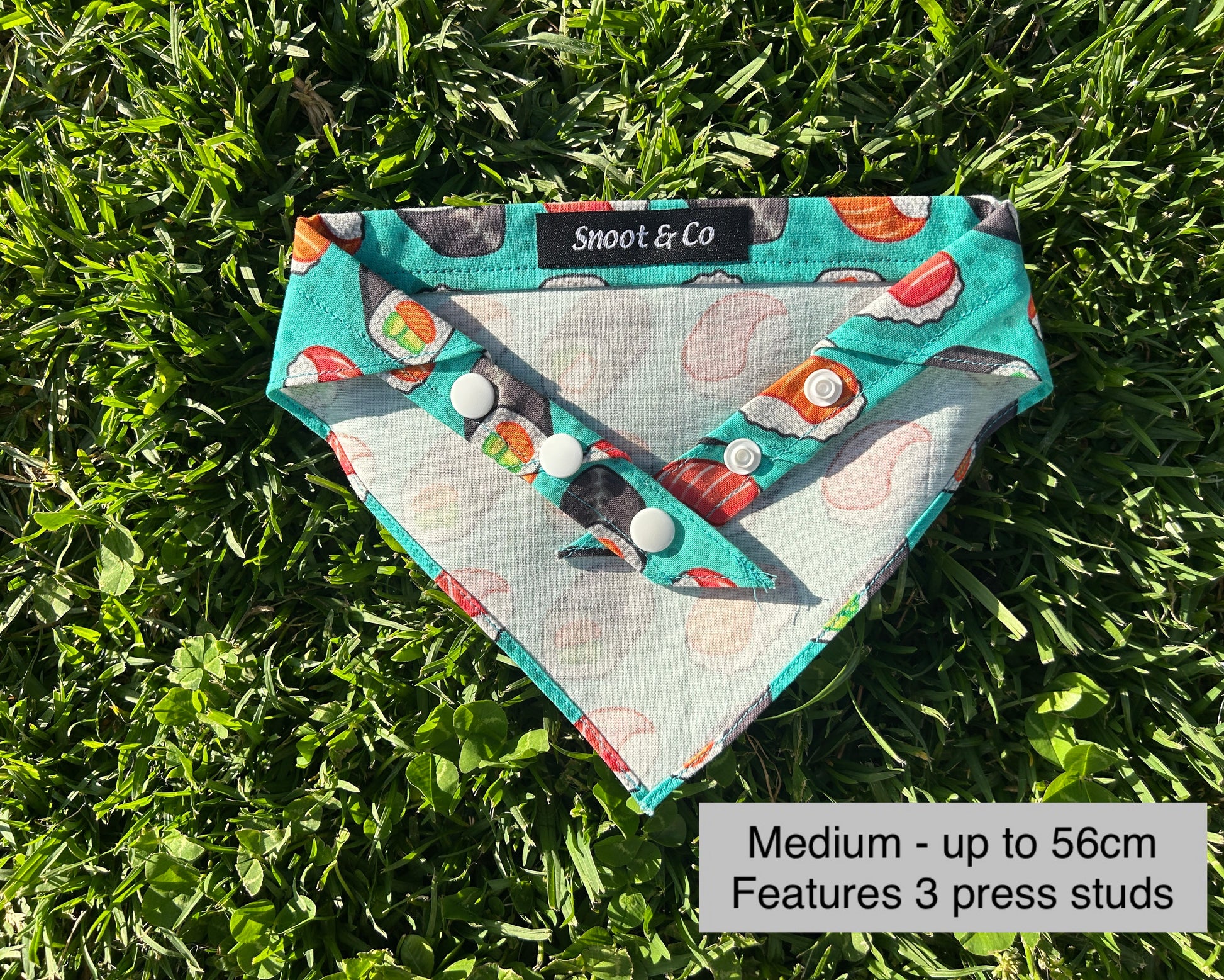 Roll into style with our Sushi Dog Bandana, a fun and quirky addition to our Food Collection! Featuring a playful pattern of nigiri, this bandana is perfect for pups with big personalities and a love for all things tasty.