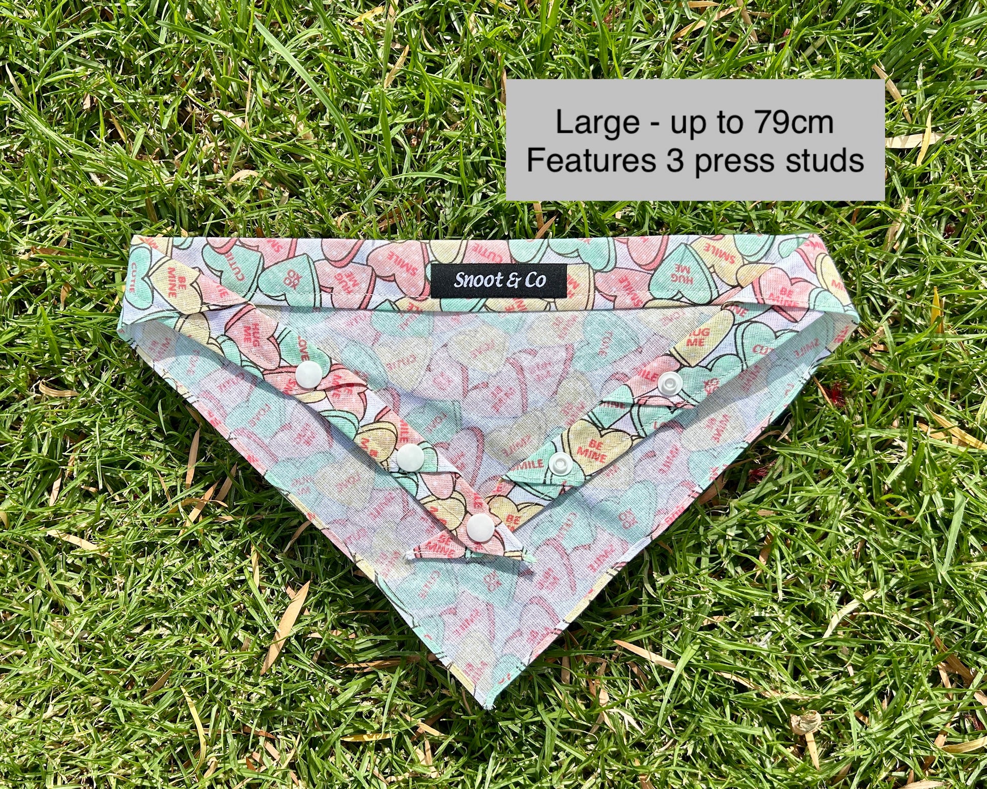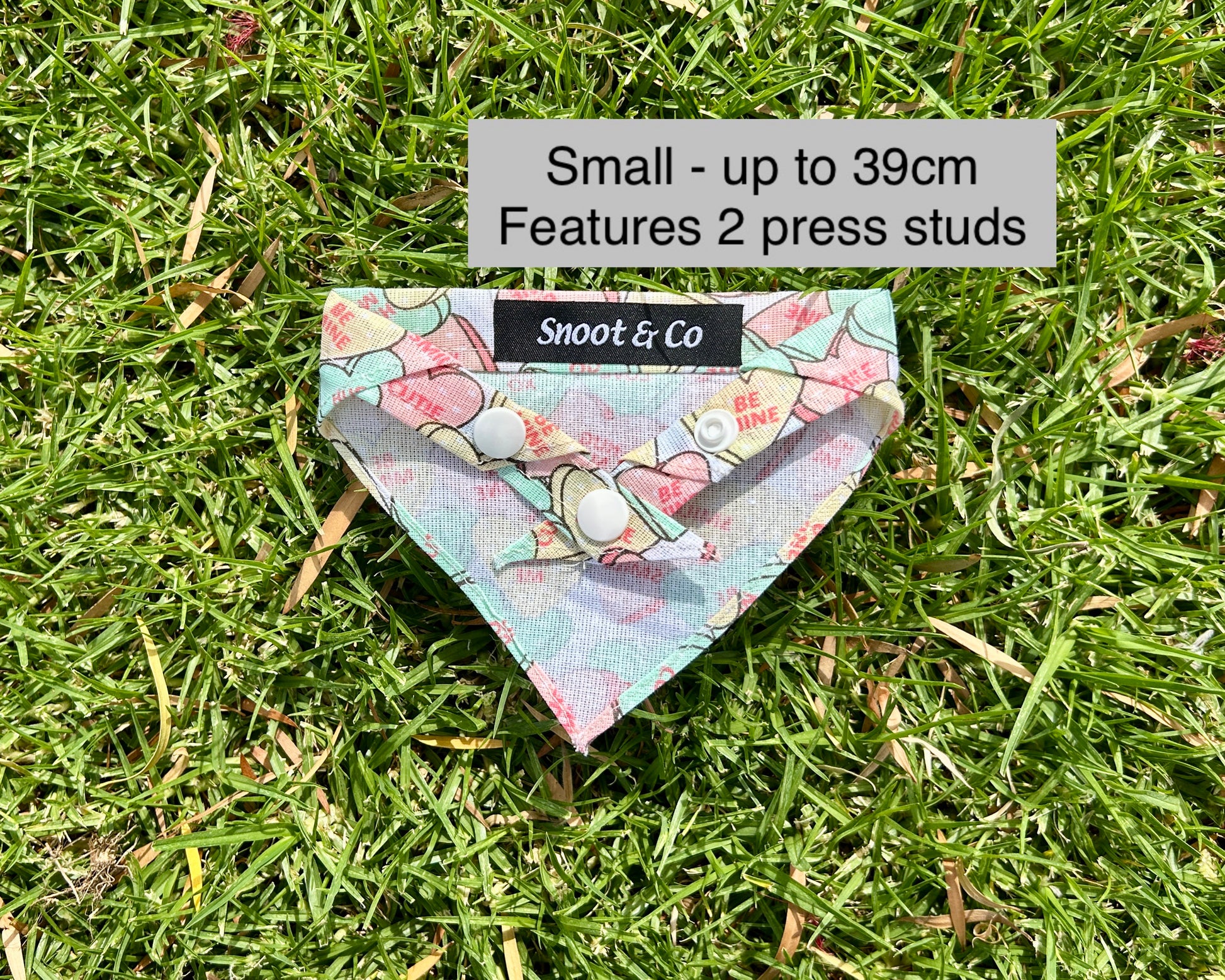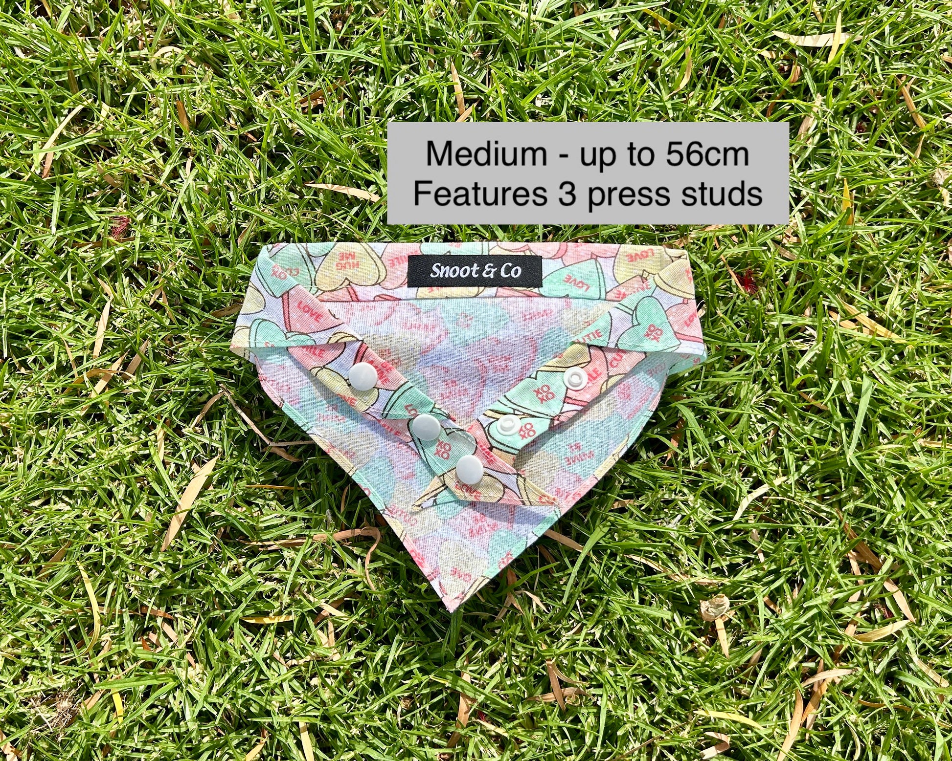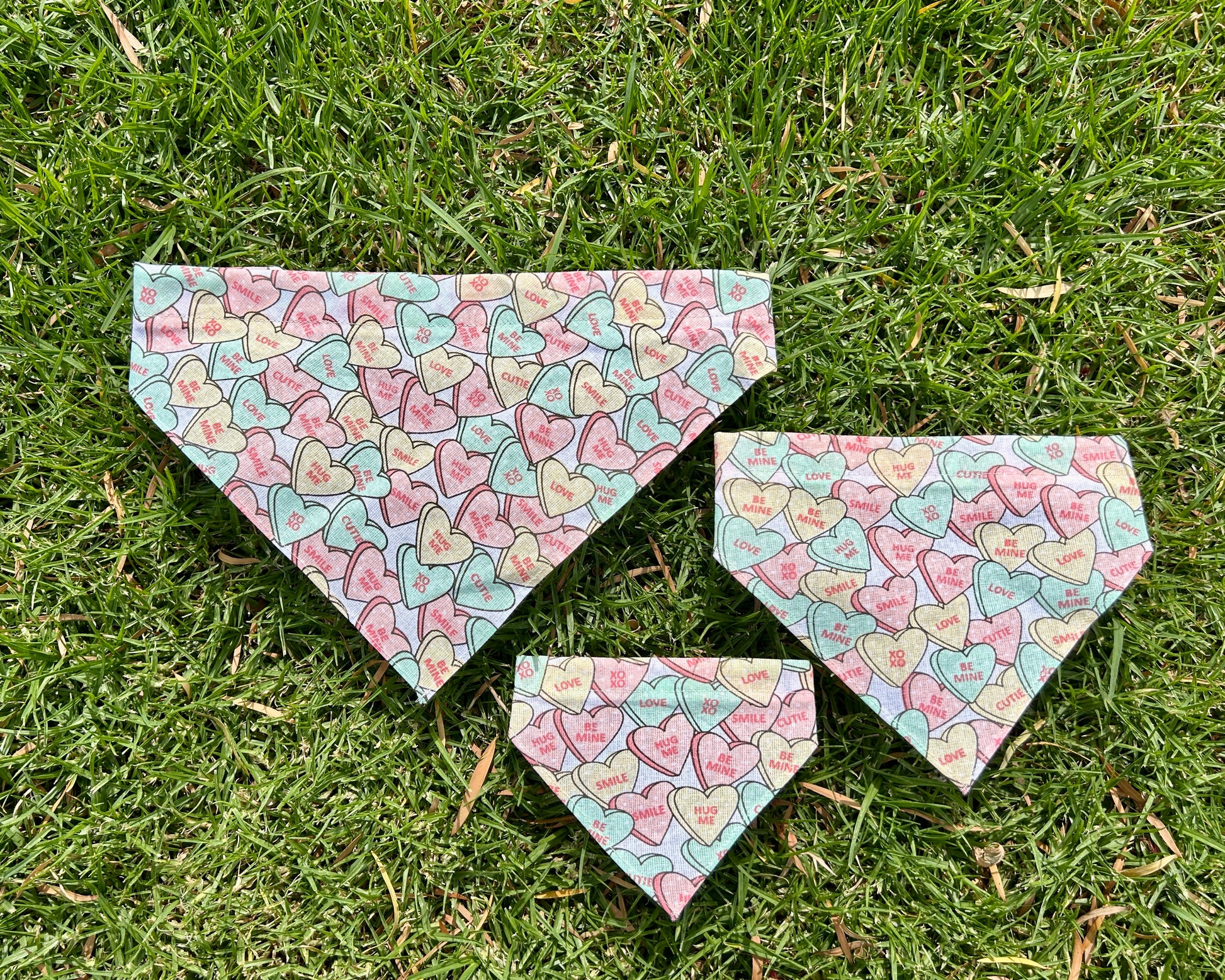 Show your pup some love with our Sweet Hearts Dog Bandana, part of our special Valentine’s Day Collection! Featuring a playful print of colorful candy hearts with sweet messages, this bandana is perfect for spreading love and cuteness. Designed with both a snap closure and tie option, it provides a secure, adjustable fit for dogs of all sizes. Whether celebrating Valentine’s Day or adding a touch of affection to everyday outings, this bandana is a charming accessory for your furry Valentine!